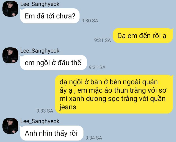 Minseok ngồi bên ngoài quán cafe , hôm nay em mặc một chiếc áo thun trắng bên ngoài là một chiếc áo sơ mi xanh dương nhạt có sộc trắng với một chiếc quần jeans xanh ngắn đến đầu gối em còn đeo khẩu trang và đội một chiếc mũ lưỡi chai đen.Đợi được khoảng 15 phút một chiếc BMW đen đỗ gần chỗ em , cánh cửa xe được mở ra một người đàn ông với vẻ ngoài vừa chững chạc vừa điển trai mặc một chiếc áo len đen cổ cao với một chiếc quần phông xám khoác thêm một chiếc áo khoác da đen bóng bước xuống ngó nghiên nhìn xung quanh như muốn tìm ai đó , em nhìn thấy khuôn mặt người này có chút quen đột nhiên tiếng tin nhắn điện thoại em vang lên ngay lúc đó em cũng thấy người kia đang đưa điện thoại lên như nhắn tin cho ai đó