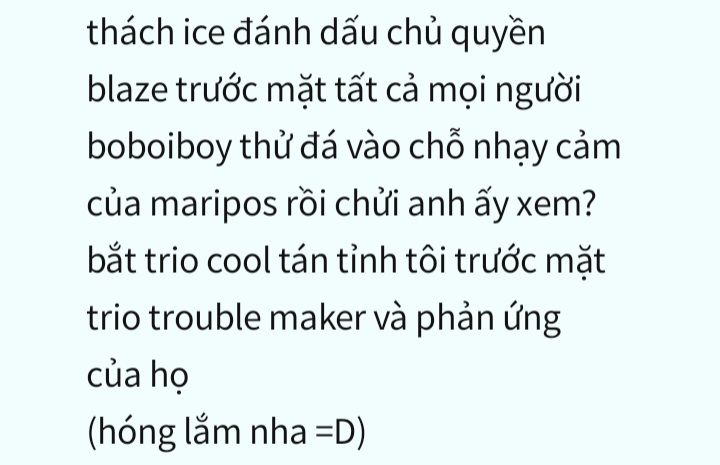 Cô với Maripos đang nói chuyện mấy cái nhiệm vụ đồ thôi, thấy tin nhắn me gửi đến mà cô ngẫm nghĩ.. Nào thằng Boi thương chồng phết, làm sao để nhỏ đá chỗ hiểm với chửi thằng chồng nó đây??