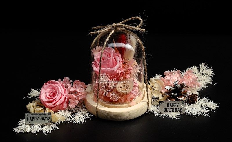 Bình pha lê tròn tròn trong suốt, miệng bình dùng một miếng gỗ bịt lại làm đế, đoá hoa hồng nguyệt quý vào thời điểm nở rộ rực rỡ nhất được hái xuống đem phơi khô để lưu giữ lại sự đẹp đẽ ấy. Cánh hoa màu đỏ, hồng nhạt, màu vàng cao thấp đan xen, như là đem một góc ban công dọn vào thế giới nhỏ này.