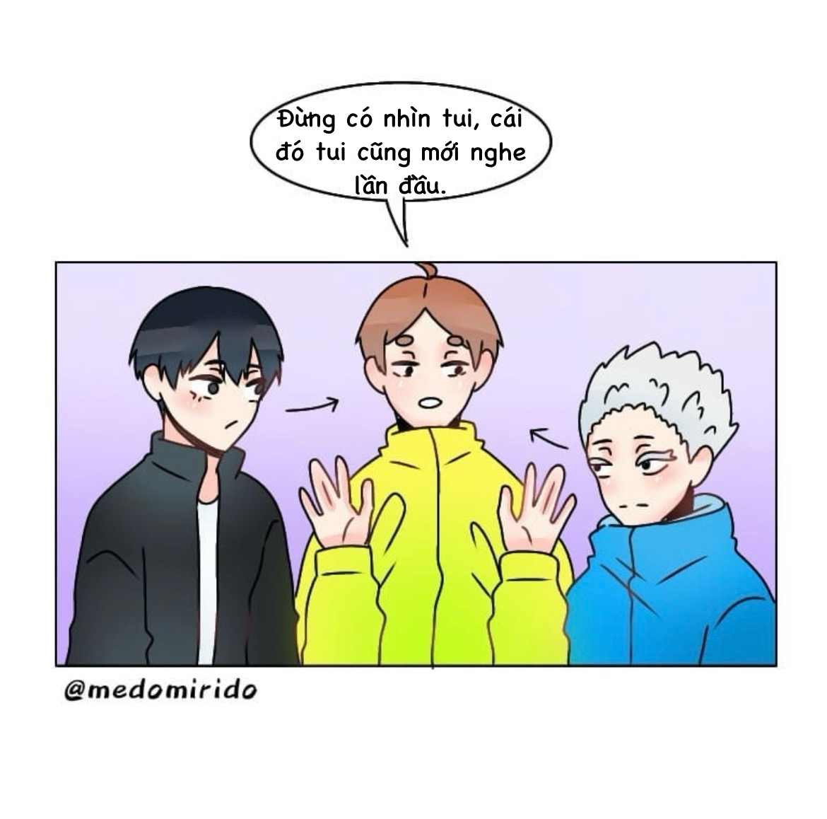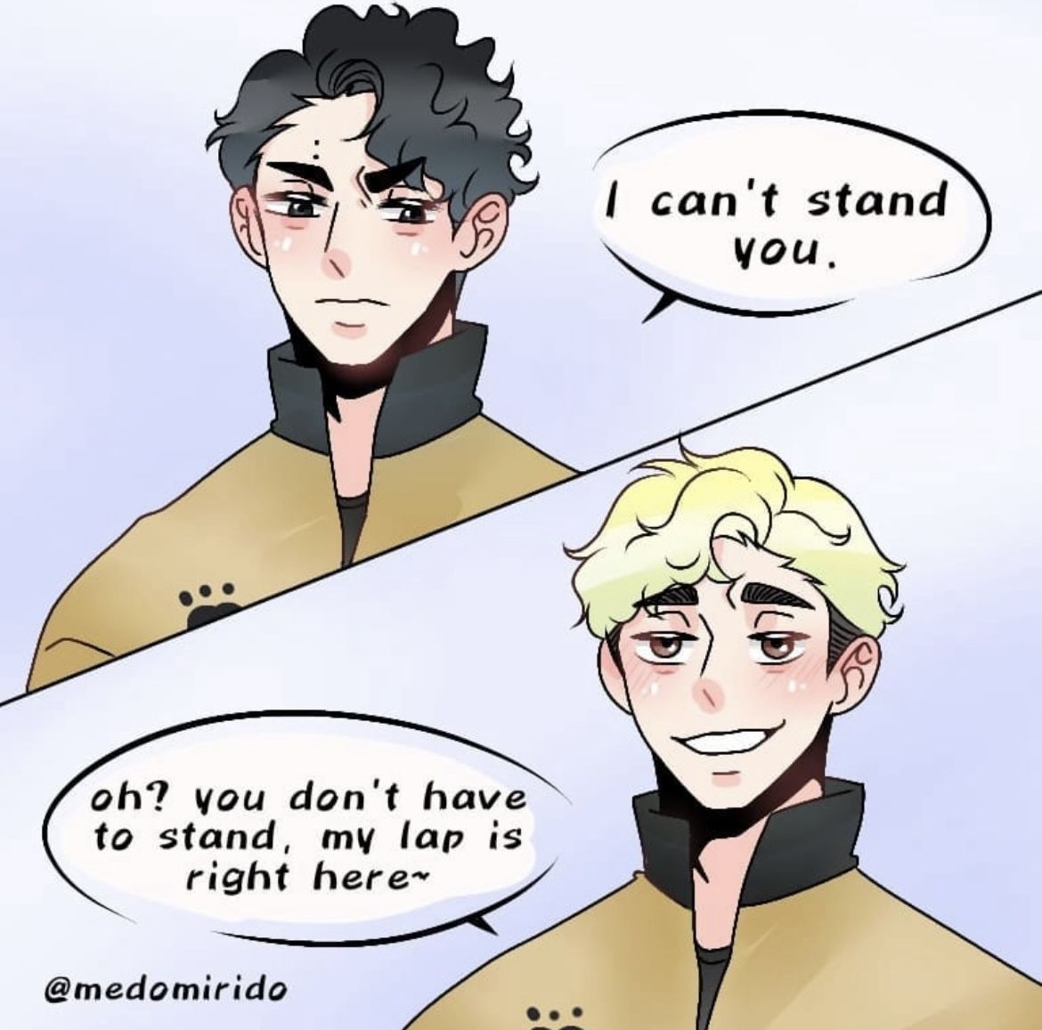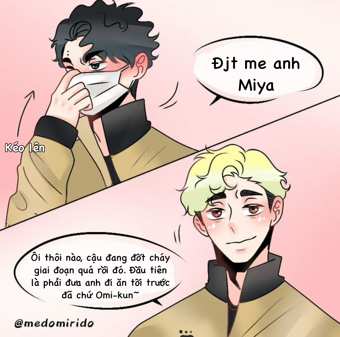 Tsumu: "Oh? you don't have to stand, my lap is right here~" dịch Việt là "Cậu không cần phải đứng đâu, ngồi lên đùi anh nè~"
