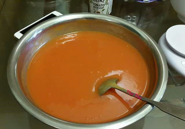 - Nước cà chua + nước ớt trộn đều + gia vị nêm, khuấy đều, lược qua rây.