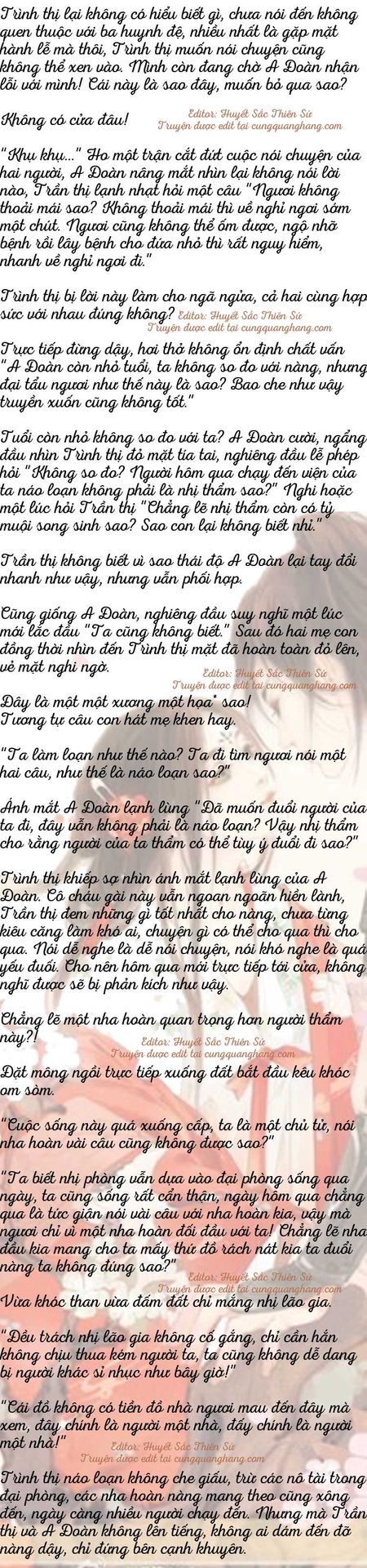 Lúc A Đoàn đến phòng chính, bất ngờ nhưng cũng không ngoài dự đoán, Trình thị đang nói chuyện cùng Trần thị. Trần thị thấy A Đoàn đến, một ít không kiên nhẫn trên mặt lập tức biến mất, vội vàng gọi A Đoàn lại
