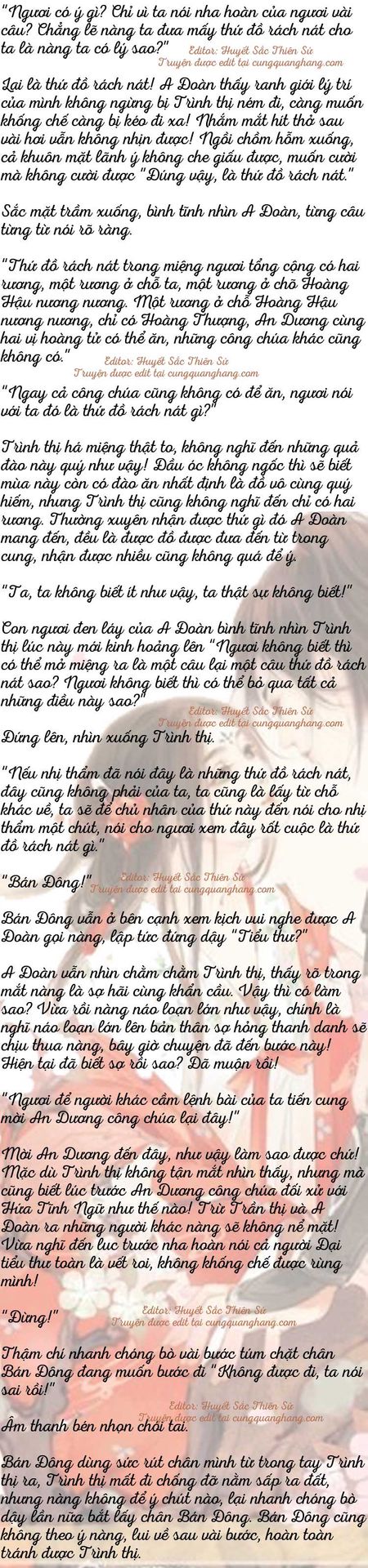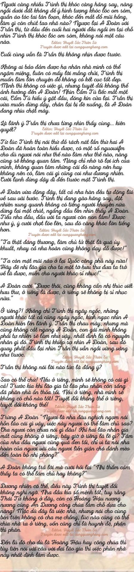 Trình thị trơ mắt nhìn Bán Đông chạy ra ngoài, ngây ngốc tại chỗ. Xong rồi, xong rồi, công chúa sẽ đến đây! Trong đầu Trình thị chỉ còn câu nói này, hoàn toàn không biết nên phản ứng thế nào. Qua một lúc lâu mới hồi phục, lập tức từ mặt đất bò lên xoay người muốn đi cầu xin A Đoàn.