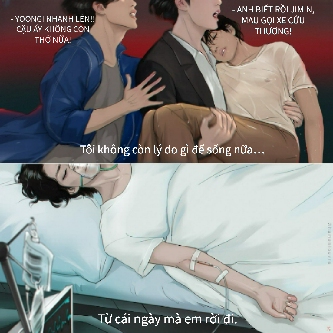 Kim Taehyung kiệt sức cả về thể chất lẫn tinh thần nên đã vô tình lạc mất ý thức. Anh quá mệt mỏi để ra bất kỳ quyết định nào và suýt chút nữa đã buông bỏ hết. Trong những lúc như thế này những người có trái tim bị tổn thương dường như họ không nhận ra được hành động của bản thân, họ chỉ muốn được giải thoát khỏi cơn đau ngay lập tức.