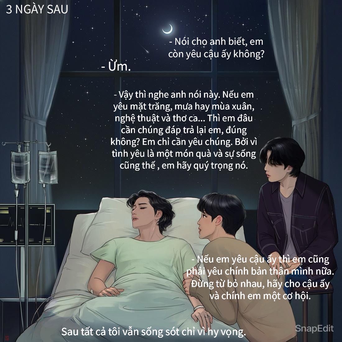 ‼️SPOIL những chap tiếp: Tiếp theo không còn có các cảnh flashback nữa, đoạn Taehyung hồi phục và nộp đơn chuẩn bị đi nhập ngũ là đã end flashback rồi, vậy nên tất cả các phần tiếp theo đều ở thời điểm hiện tại và phần sau tiếp tục gặp lại user 'juliettkilo', bác sĩ Kim sẽ phát hiện ra người đàn ông bí ẩn mà ai cũng biết là ai này. Cuối cùng Taehyung với Jungkook sẽ phải đối mặt với hậu quả của sự cố vụ tập trận bắn đạn (vào chap "LỪA DỐI" để xem lại).