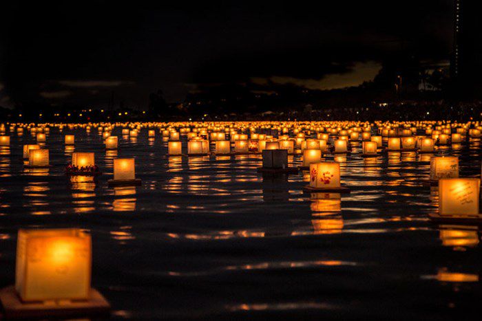 Dưới mặt biển rộng lớn, chảy từ cuối sông ra là hàng trăm chiếc đèn lồng sáng rực tỏa ra khắp mặt hồ. Trong đó, có một dãy đèn lồng chỉ đi theo một đường thẳng tiến càng lúc càng xa.