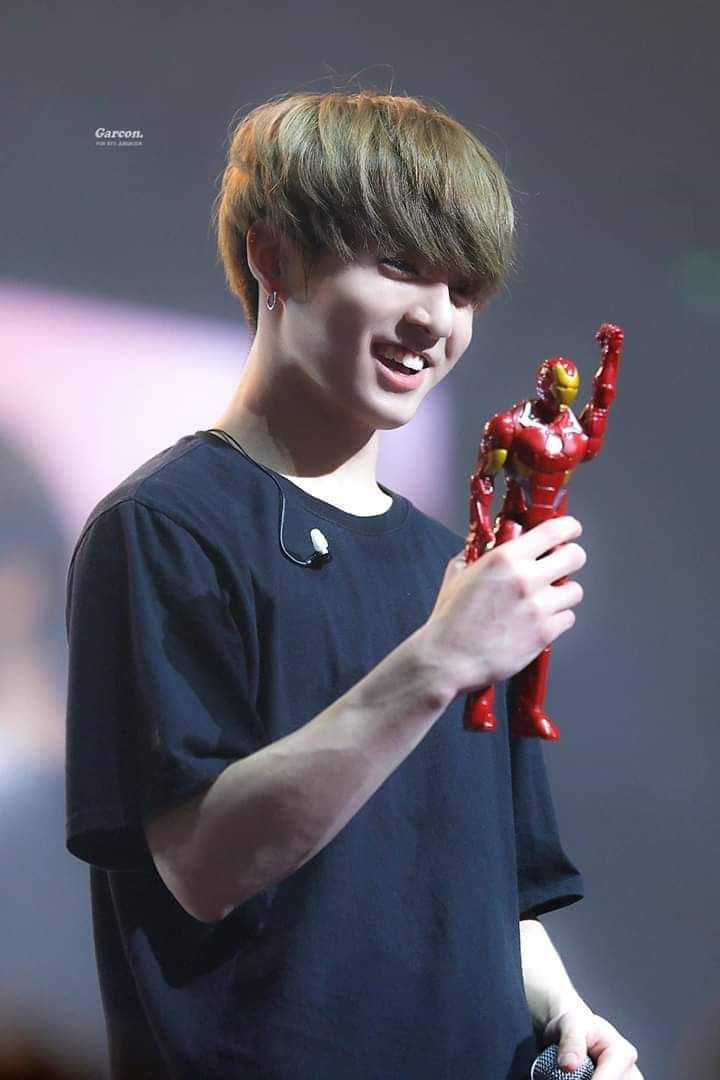 Nhớ tới món đồ chơi yêu thích của mình Kookie lại chu mỏ trầm trồ. Đó là một con Iron man cỡ nhỏ, appa đã mua bạn ấy cho bé hồi sinh nhật năm bé lên ba tuổi. Vì từ 'Iron man' khó đọc quá, appa dạy mãi mà Kookie chẳng đọc được, chỉ toàn chu mỏ lên đọc "Ai dun men" mãi thôi, vậy nên Kookie gọi bạn là 'Siêu nhân đỏ' cho dễ dàng.