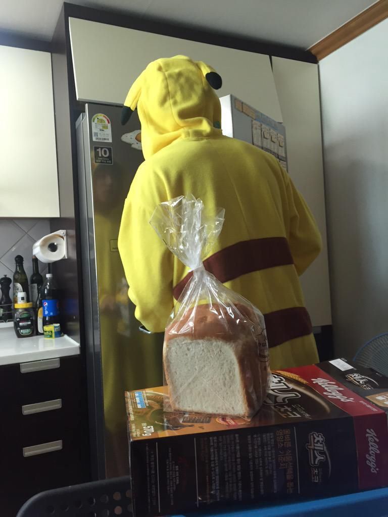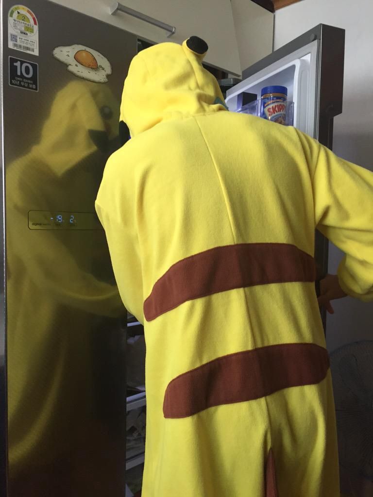 Vừa vào thì thấy một người con trai cao to mặc đồ Pikachu đang đứng tìm sữa chuối trong tủ lạnh