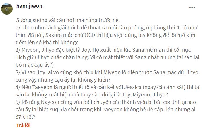 - Sana cũng đã có thắc mắc tương tự. Cậu ấy hỏi Joy "Các người vào đây làm gì?" và Joy cũng đã trả lời cậu ấy rồi (chap 5 phút cuối cùng). Còn nếu nói "Jihyo bỏ mặc Sana" vậy thì, nếu không bỏ mặc thì lúc đó cậu ấy nên làm gì đây?! =))