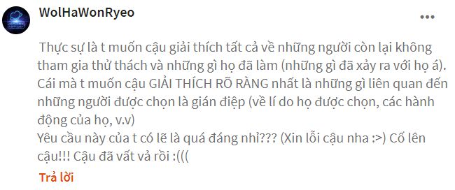 Cơ mà tớ xin phép không trả lời nha :> Lý do vì sao tớ lại từ chối trả lời câu hỏi này thì tớ cũng đã giải thích với cậu ở phần trước rồi đó. Mong cậu thông cảm và cảm ơn cậu vì đã thích câu chuyện của tớ đến như vậy nha ^^