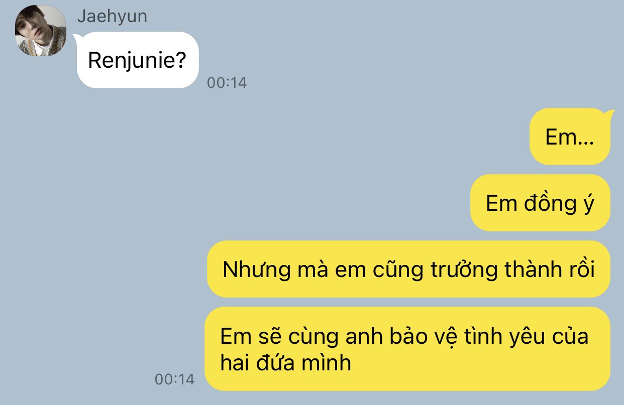 "Jaehyunie cũng là người yêu của em rồi." - Cậu thì vừa vui lại vừa có phần ngại ngùng, thỏ thẻ đáp lại lời của anh.
