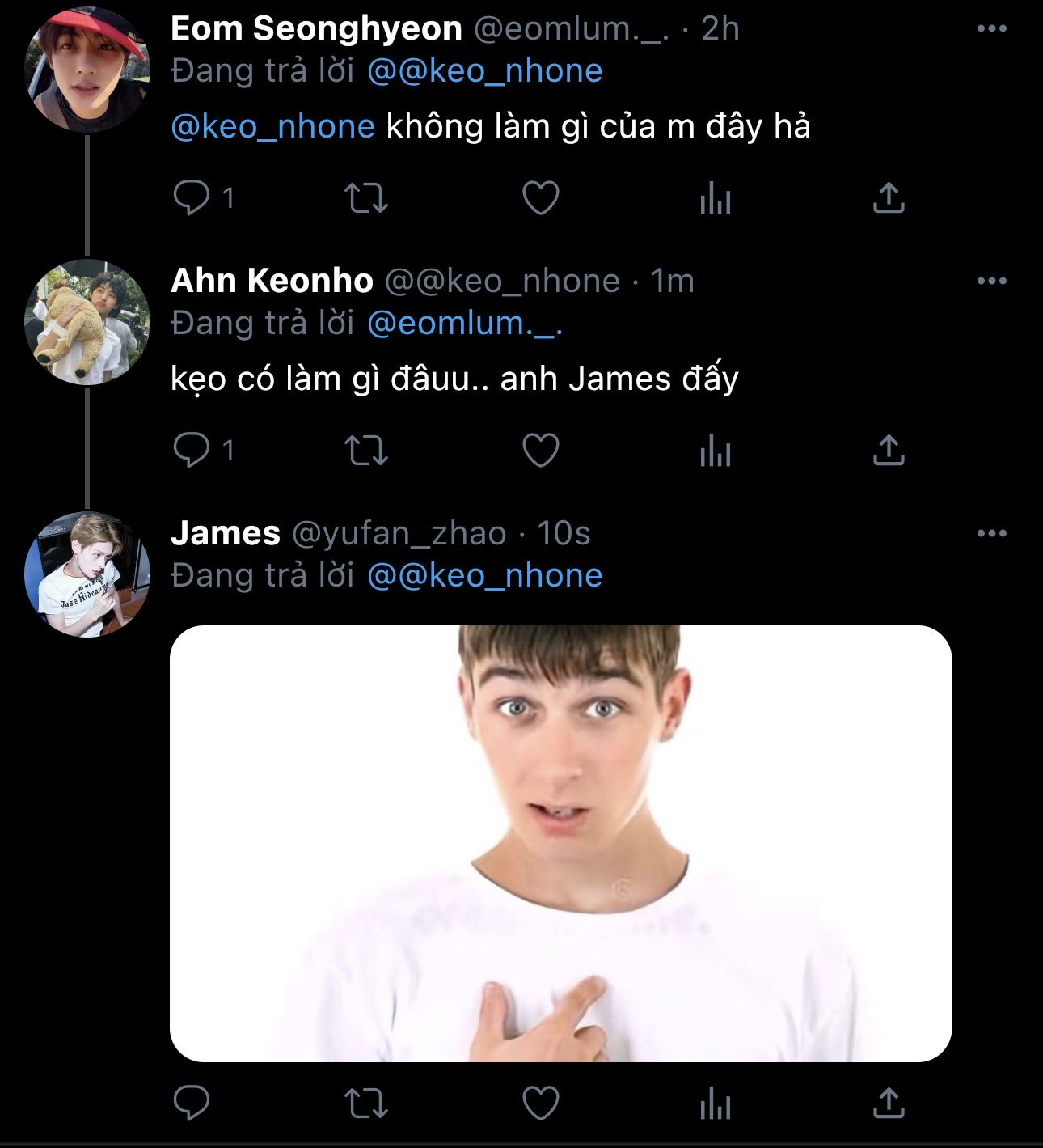 Keonho : -"Thế từ hôm nay đến về sau cho phép kẹo hộ tống lúm cả đi cả về lun ná"