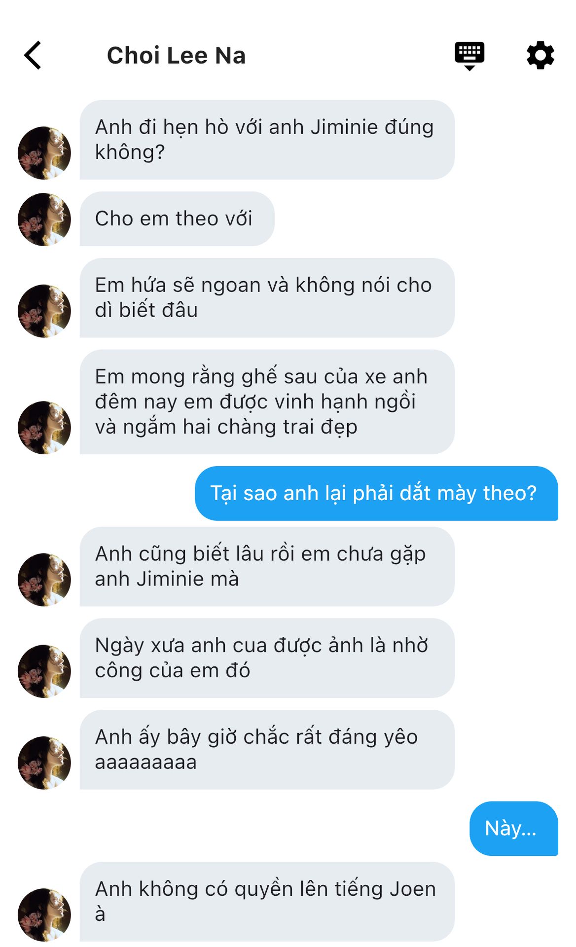 Jimin lướt nhìn điện thoại rồi quay sang, tò mò hỏi hắn: "Em và con bé lại mang anh ra cá cược à?" Giọng nói đanh lại nhưng không hề hung dữ, ngược lại rất đáng yêu.