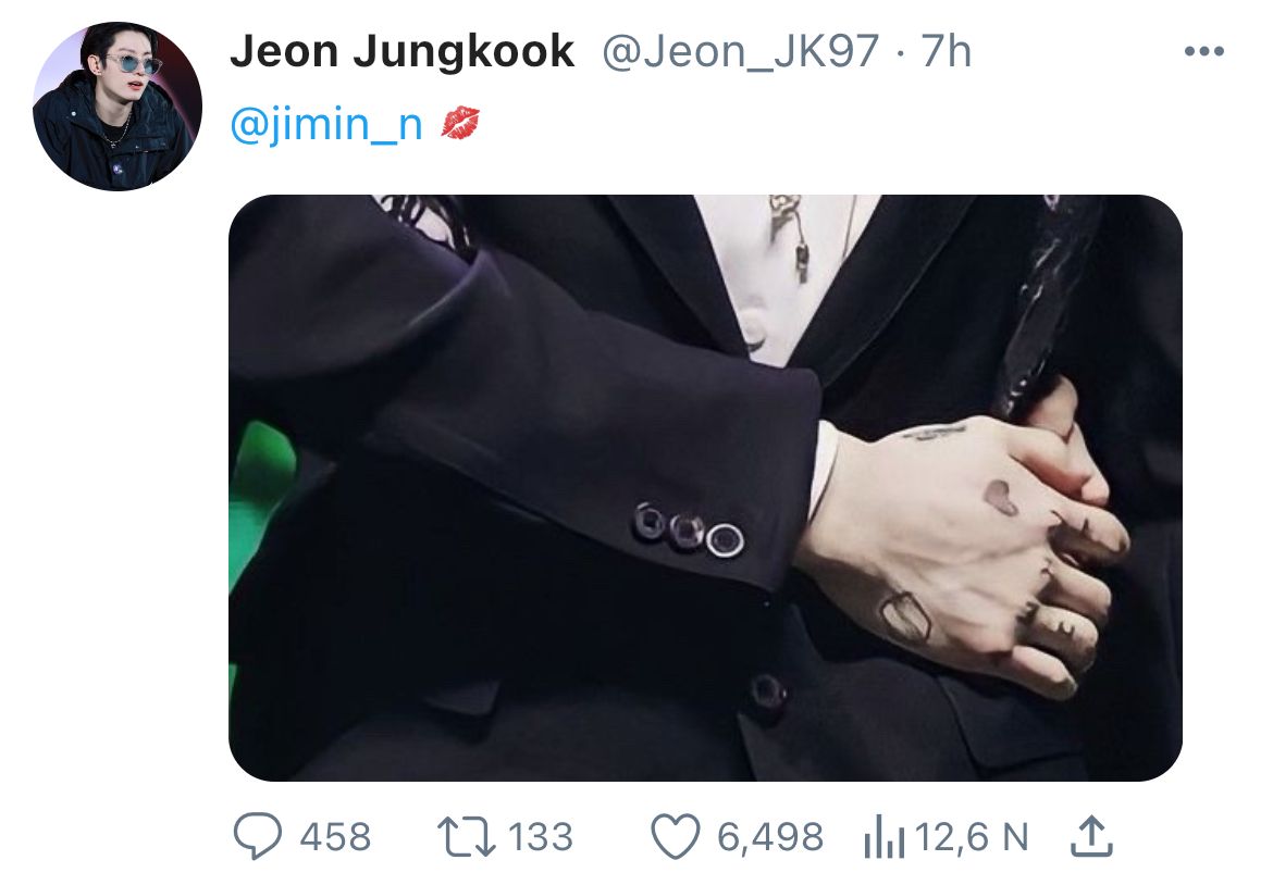 Jungkook ngơ ngẩn đưa tay lên đầu làm động tác đầu hàng: "Em không có. Chỉ có mỗi mình anh. Em nhịn suốt thời gian qua, chỉ dùng tay thôi, không hề có thêm ai khác. Chỉ có Park Jimin và đôi tay này."