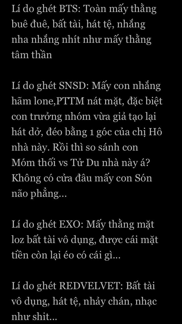 Thứ hai họ rất giỏi. SNSD còn là nhóm nhạc quốc dân. BTS là nhóm từ vô danh—>DAESANG đó. Còn hai nhóm kia thì mình chưa tìm hiểu kĩ nên chưa biết. Vón có chap bạn nói BLACKPINK xấu và nói họ là HẮC HƯỜNG. Thế cho mình hỏi nhé hắc hường là j??Bạn bảo bạn anti BTS mà bạn lại ghép cặp Kooktzu ah??Cảm giác con này có vấn đề thần kinh.😑😑😑😑Mình chỉ nói về bạn này tới đây thôi ko máy hỏng vì nói về bạn này. Các bạn có ý kiến j thì cm cho mình biết nhé. Bye.