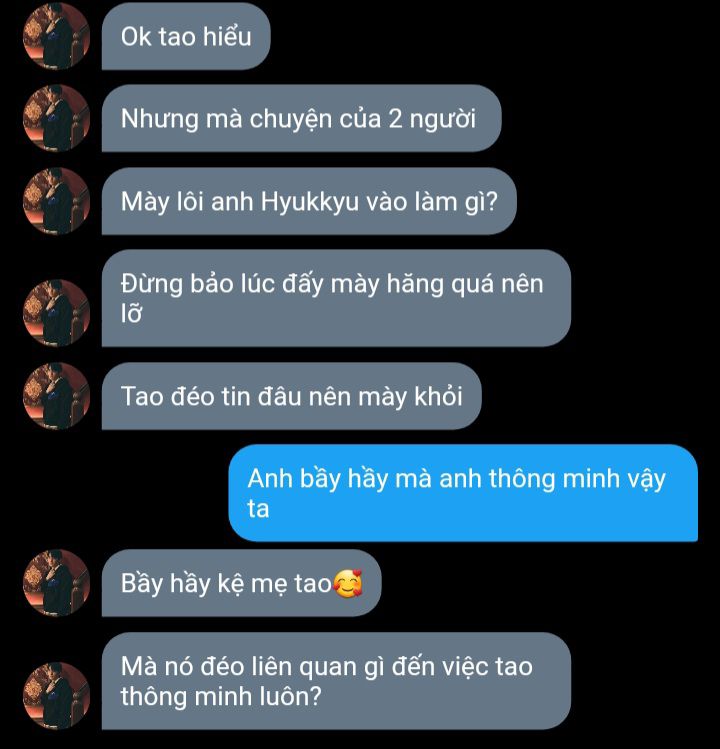 Đùa vậy mà thằng Wangho tin thật. Nó bị tình yêu che mắt à? Cậu và anh thậm chí còn chẳng giống nhau xíu nào từ ngoại hình đến tính cách. Hyukkyu thật ra chẳng kể cho Kwanghee gì hết. Anh cậu đã không muốn kể thì có bắt ăn cà rốt luộc cũng không hé nửa lời. Đồ lạc đà lì lợm! Vừa lì lợm vừa ngu ngốc!