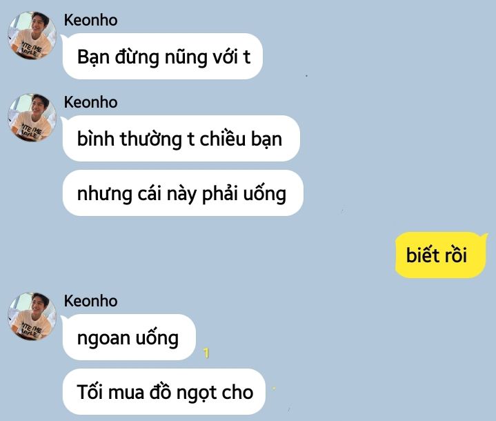 Sau tiếng hét ai oán thì Seonghyeon cũng đã xong chương trình uống thuốc, giờ em được Keonho tận tình bế lên giường ngủ. Cậu dịu dàng xoa tóc em, khẽ bật cười khi nhìn khuôn mặt đỏ ửng cùng đôi mắt lơ mơ của Seonghyeon. Keonho nghiêng đầu, cất giọng nói nhỏ.