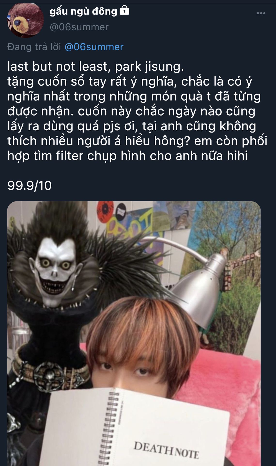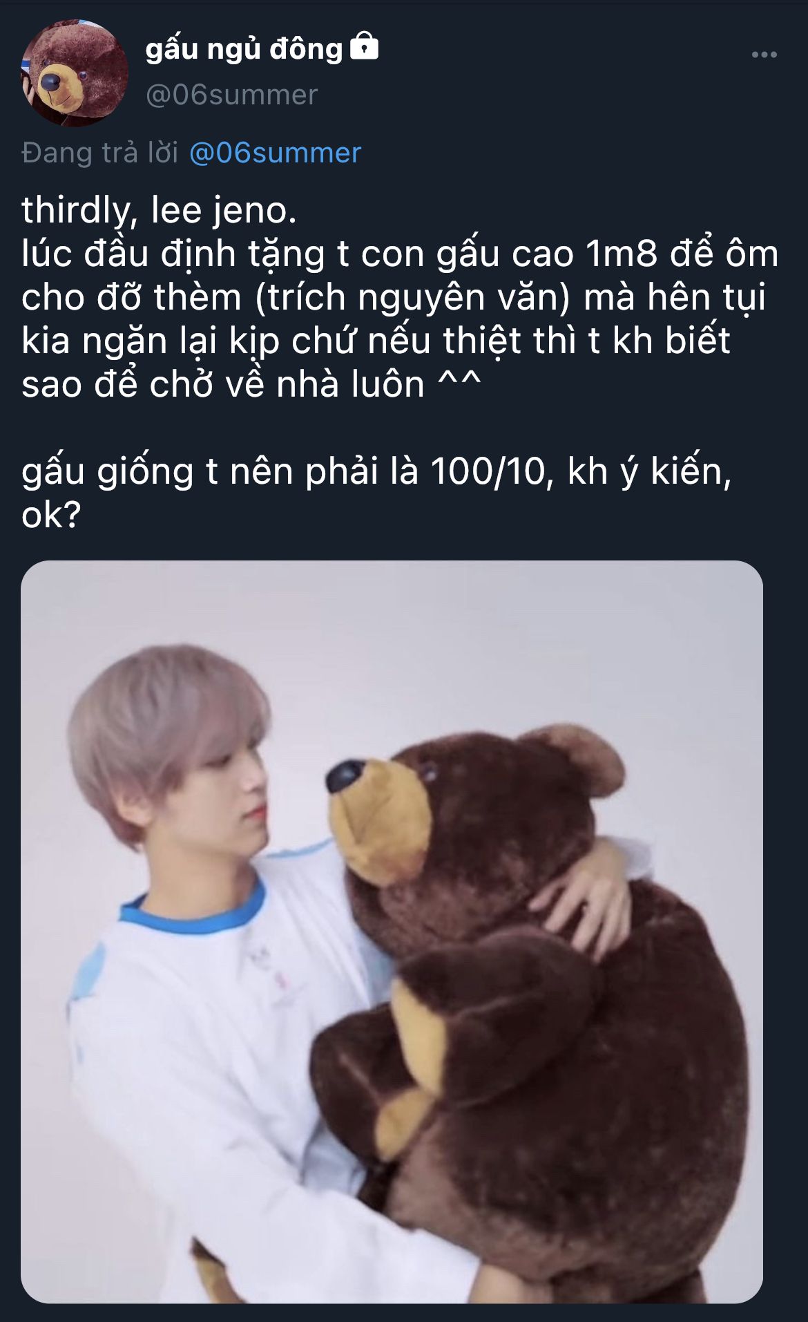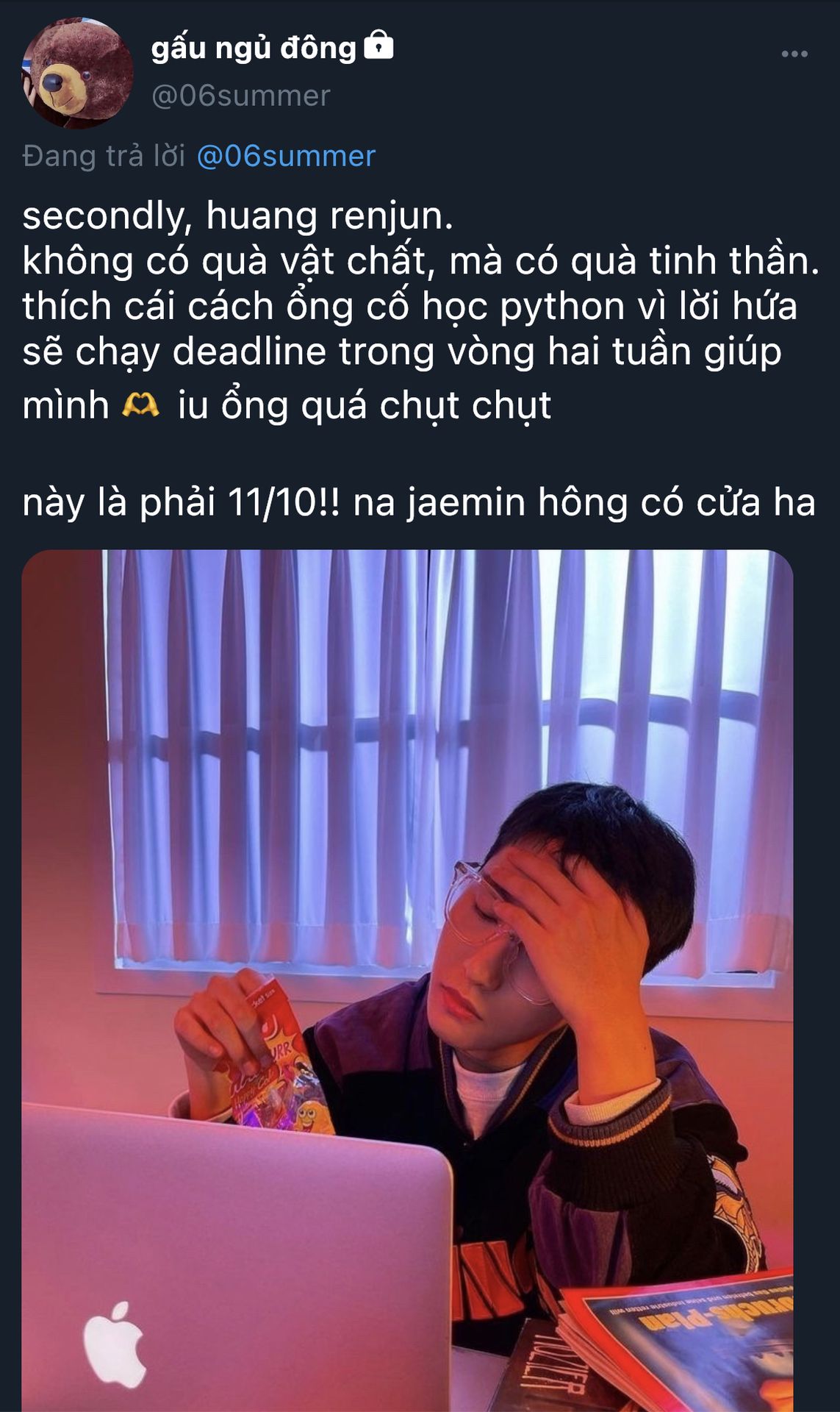 Chúc mừng sinh nhật của Lee Donghyuck ʕ•ᴥ•ʔ. Mong mọi điều tốt đẹp sẽ đến với Donghyuck, nhớ uống thật nhiều nước, ăn thật nhiều món ngon và ngủ thật sâu không gặp ác mộng nhé. Thời gian tiếp theo mong Donghyuck vẫn sẽ luôn là một ánh mặt trời nho nhỏ soi rọi bước đường của chúng ta. Tuổi trẻ rất ngắn, Donghyuck hãy tranh thủ trải nghiệm và tích luỹ những kiến thức quý giá nhé (●'ω`●).