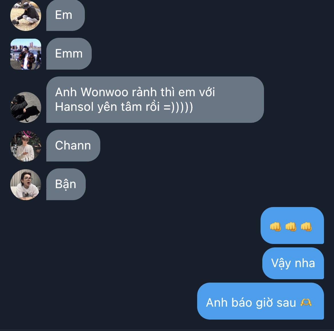 "Tôi thấy trưa nay cậu không nhắn gì, đoán chắc cậu bận nên mang ít đồ ăn đến. Canh vẫn còn ấm..." Minguk nói, hơi nhỏ, nhưng vẫn đủ khiến cả đám dừng lại, đồng loạt "ồôô~"