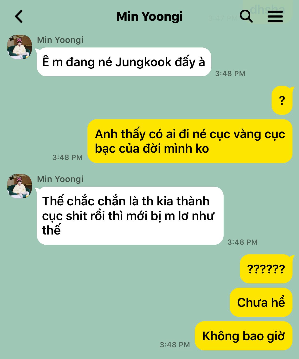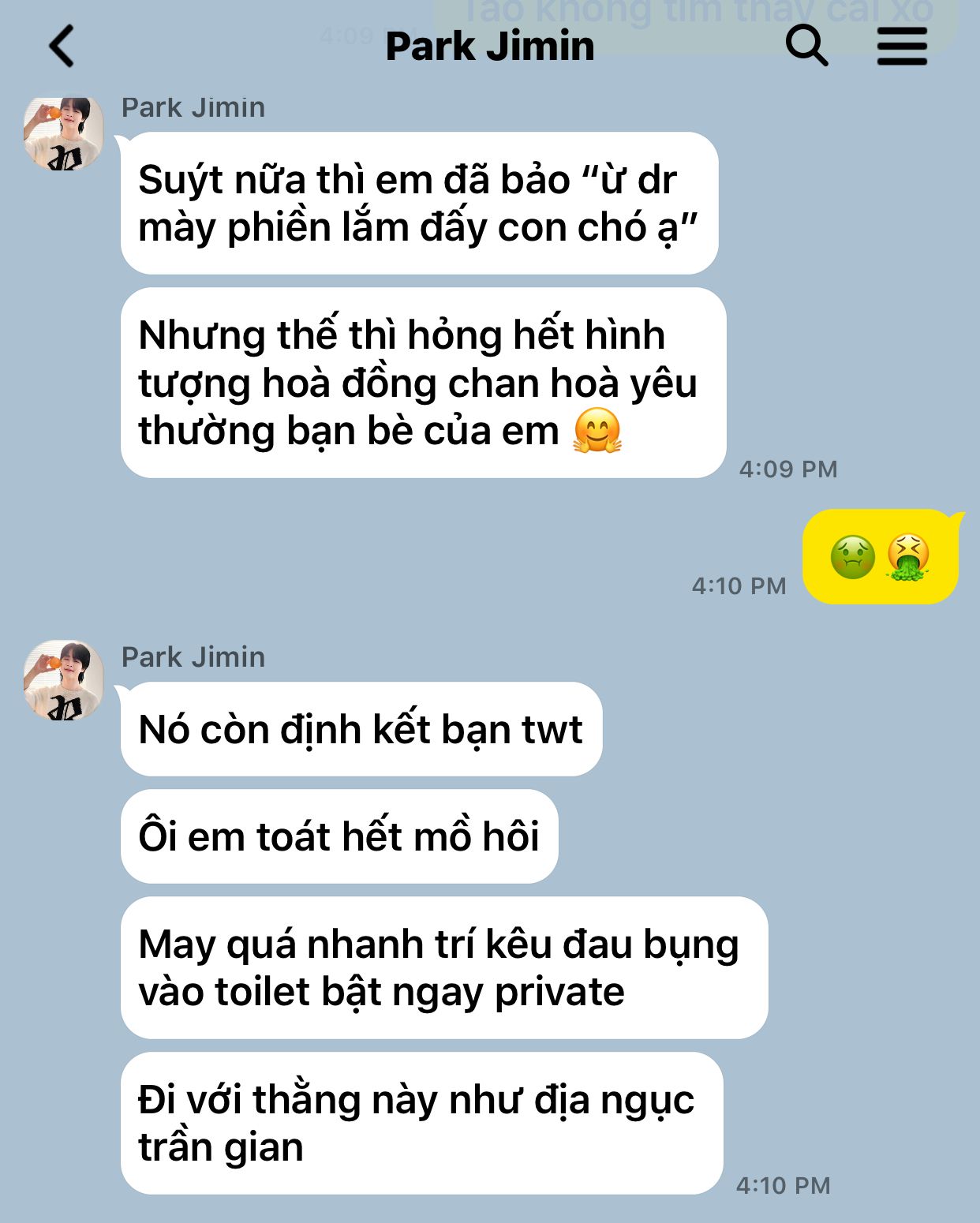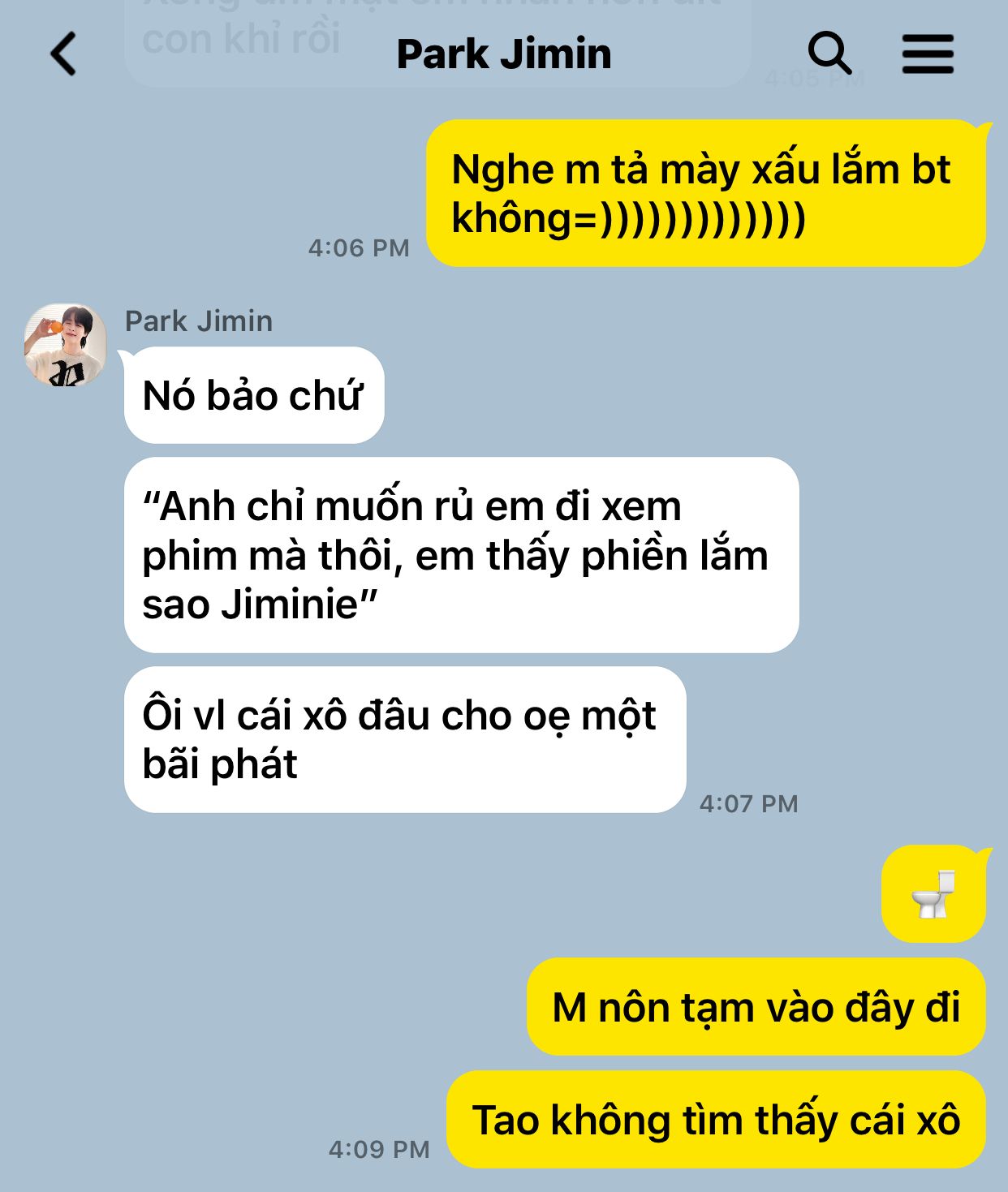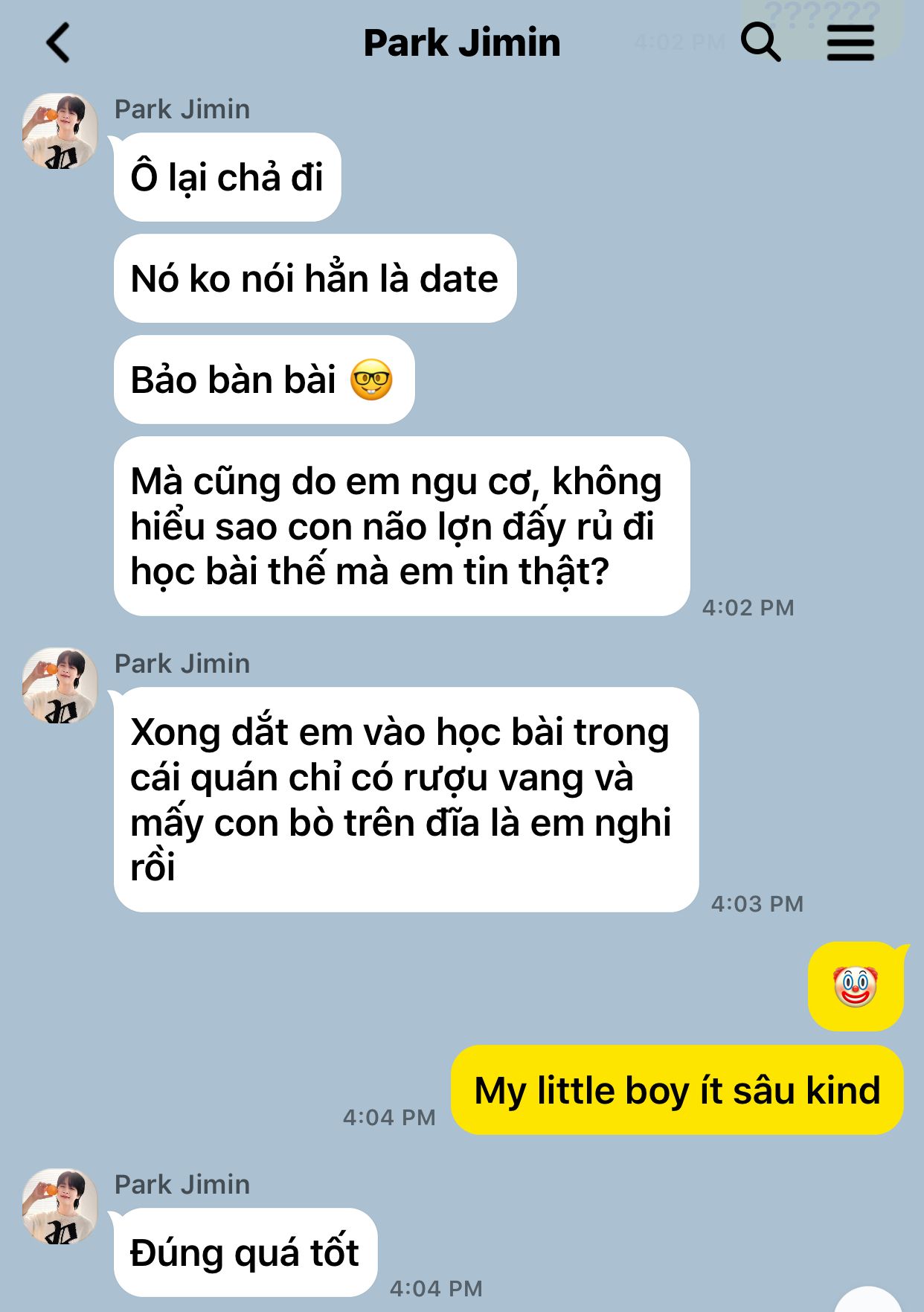 Vì cảm thấy áy náy, Jimin cuối cùng cũng quyết định sẽ xin lỗi Jungkook. Vừa nhắn tin, Jungkook đã trả lời luôn khiến Jimin mừng lắm, nhưng mà..