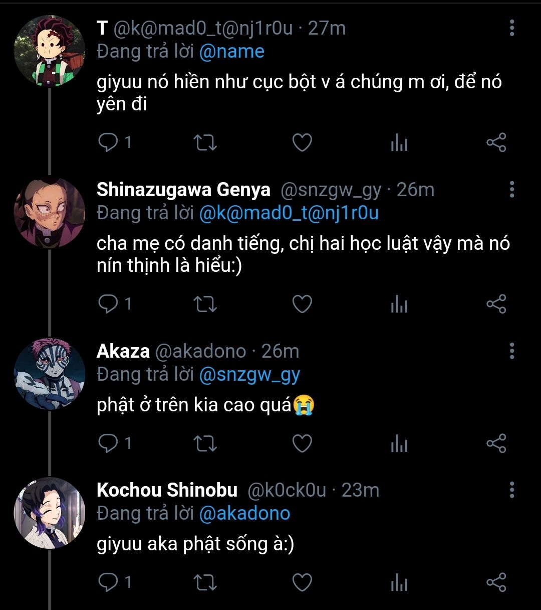 douma, muichirou, sabito - những người đầu tiên lên tiếng, sanemi thì khỏi phải nói, anh gần như muốn đập vỡ cái điện thoại khi đọc được bình luận nói cậu "nhìn mặt là biết dân lùa gà rồi, nói vài câu là mấy em gái tin sái cổ" hay những dòng đoán già đoán non về tính cách, quá khứ, năng lực của cậu. dù bạn bè bảo vệ cậu như thể bảo vệ một thứ gì đó mong manh và quý giá nhất trần đời, nhưng không hiểu vì lý do gì mà tài khoản ẩn danh cứ ngày càng nhiều, những lời nói dối trôi theo hàng loạt tài khoản ảo như nước vỡ bờ.