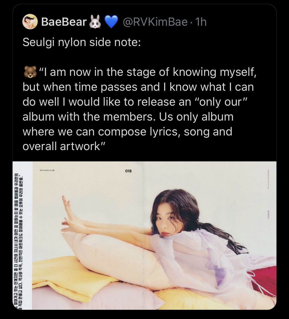 Seulgi: "Điều này vẫn luôn làm mình choáng ngợp, chính là khi mình gặp những hậu bối, những người mà sự nghiệp của họ và ước mơ của họ bắt đầu sau khi nghe nhạc của Red Velvet. Mình muốn tìm hiểu về họ nhiều hơn~" *cười*