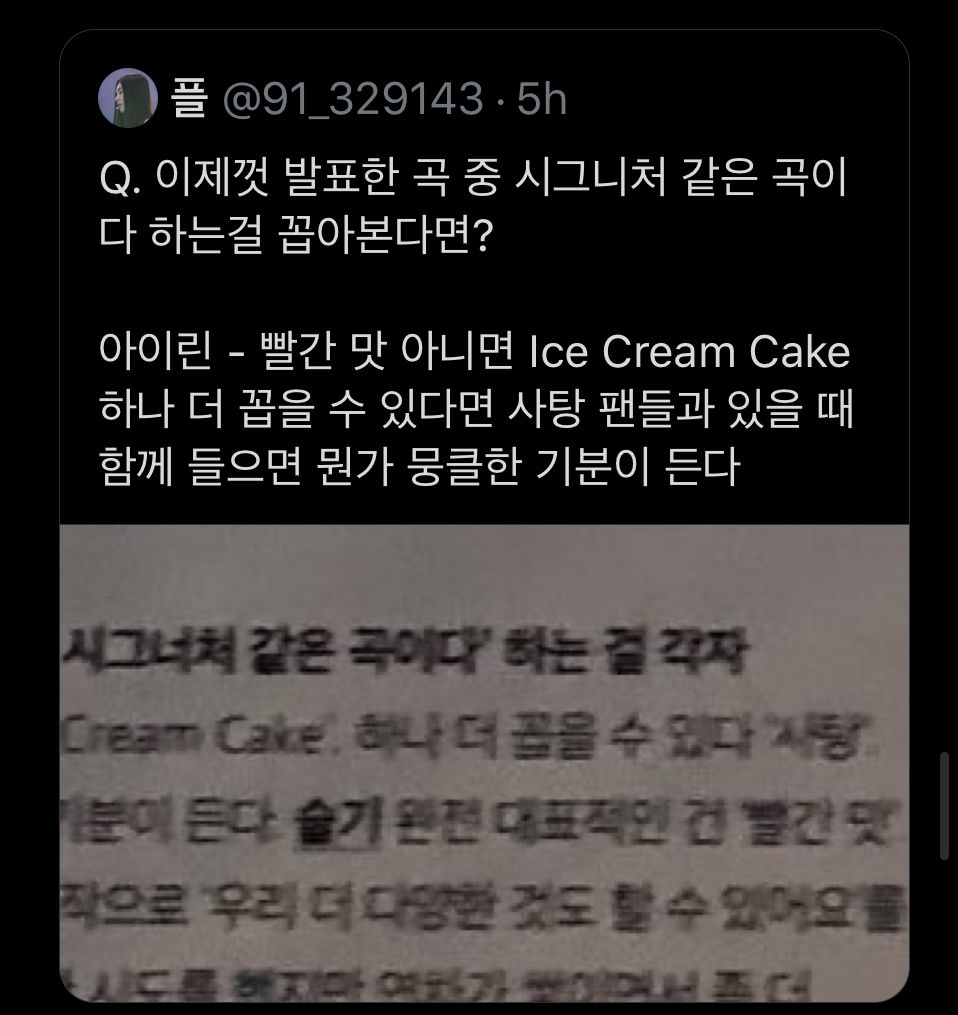 Joohyun: "Red Flavour hoặc Ice Cream Cake. Nếu có thể chọn một bài khác thì chắc là Candy. Khi tụi mình nghe chung cùng với fan thì nó nghe rất là buồn."