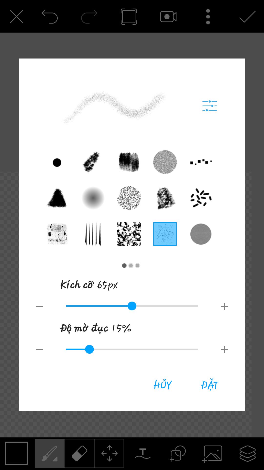 Vào công cụ vẽ thì bạn cần chọn BIỂU TƯỢNG BÚT VẼ (tui gọi nói vậy nó vậy thôi). Khi nó hiện lên giao diện như kia thì chọn theo tui nhé. Cái này chủ yếu dùng để dặm nền cho thôi các bạn ạ.