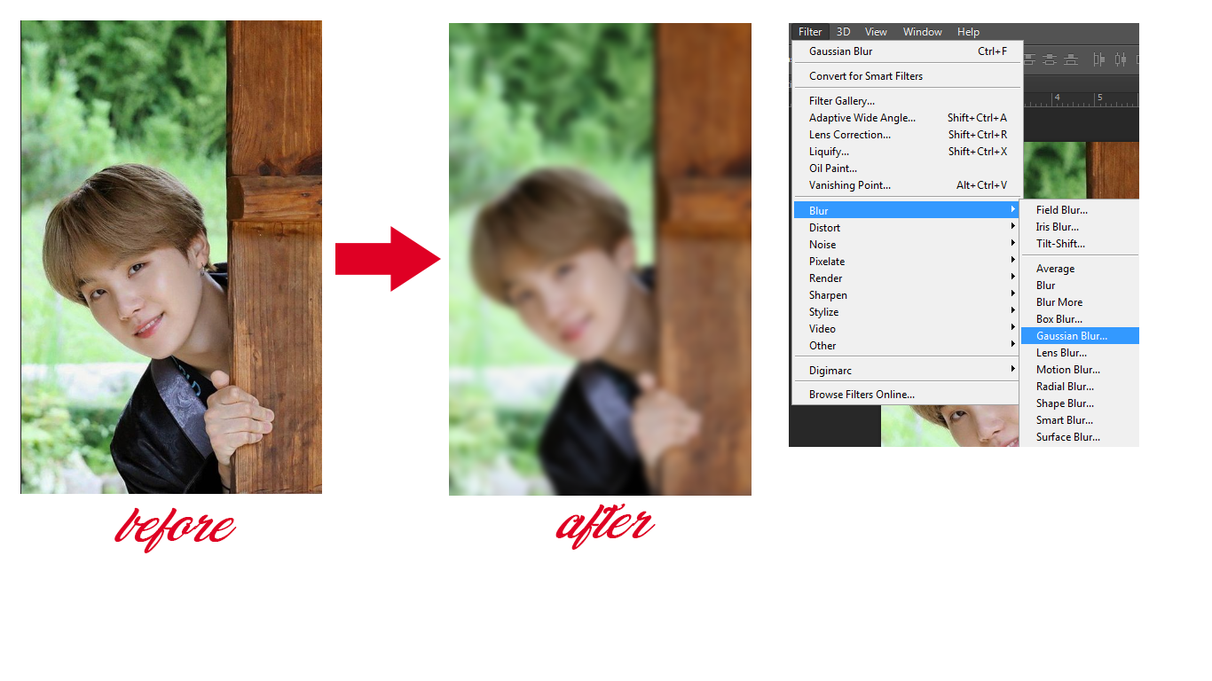 Bước 2: Mở ảnh hoặc cop ảnh model thứ nhất vào, sau đó để mờ mờ ảo ảo như này thì nhấp vào "Filter" (pick... your... filter ~) -> "Blur" -> Gaussian Blur và chỉnh thông số tùy ý (tớ chọn 3.0).