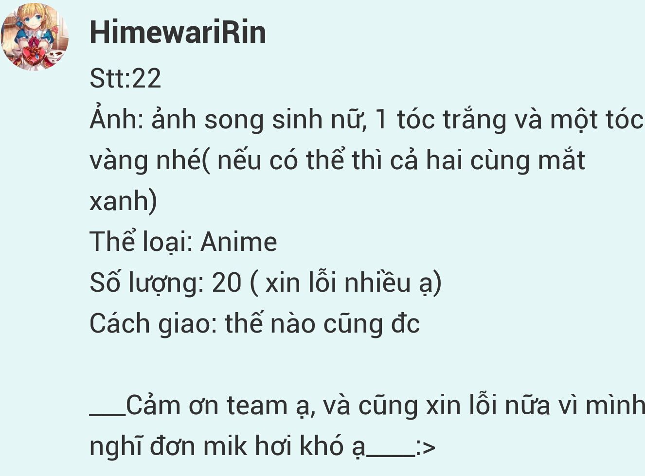 Cảm ơn cậu đã đặt đơn bên team chúc tớ >< chúc cậu có một ngày tốt lành