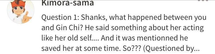 Author: *smiles back at him* Alright! *looks through papers* Ah...*furrows brows* I apologize in advance Shanks. These questions are a bit...difficult.