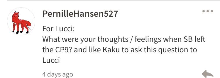 Lucci: *closes his eyes* In truth, I didn't quite expect her desertion from CP9. But at the same time...I felt it was something that she would do. *opens his eyes when he heard the author making noises*