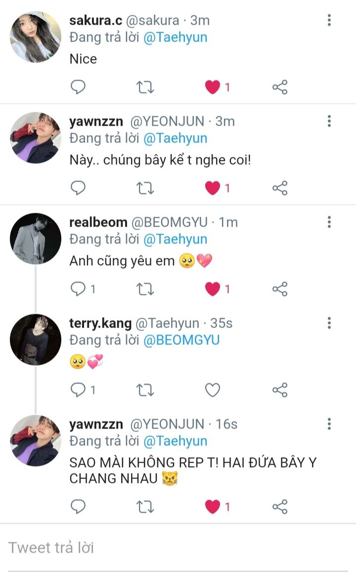 Beomgyu khó chịu lấy túi xách bỏ về. Vốn dĩ là Kang Taehyun không hề thích anh, nhìn nó cười vui vẻ bên cạnh cô gái kia xem, đúng là tự mình đa tình mà.