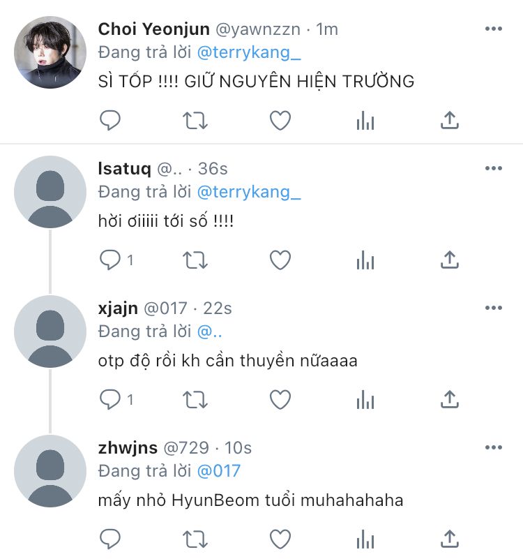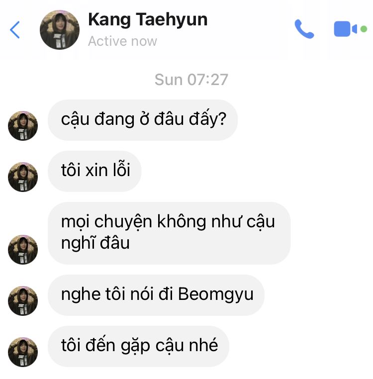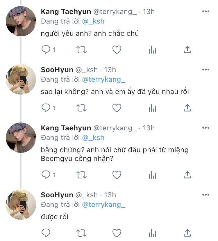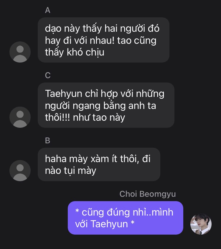 "cái Taehyun thích mày đấy, anh biết chuyện hôm đấy là hiểu nhầm. Khuyên nó thì nó ứ chịu nghe"