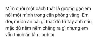 *Đoạn sau càng không ổn, cậu đã dùng ngôi thứ ba để nói hộ nhân vật thì sẽ chẳng ai gọi món ăn của người mình yêu là "chẳng ra gì" cả. Tâm lý nhân vật không phù hợp với mạch buồn từ đầu truyện, đọc sẽ gây cảm giác khó chịu. Đoạn văn như một câu tự sự nhàm chán, chẳng thấy biểu cảm và nghe rất không hợp với tính chất bài. Đáng ra nó nên là một trong những điểm nhấn nhưng cậu chưa làm điều ấy.
