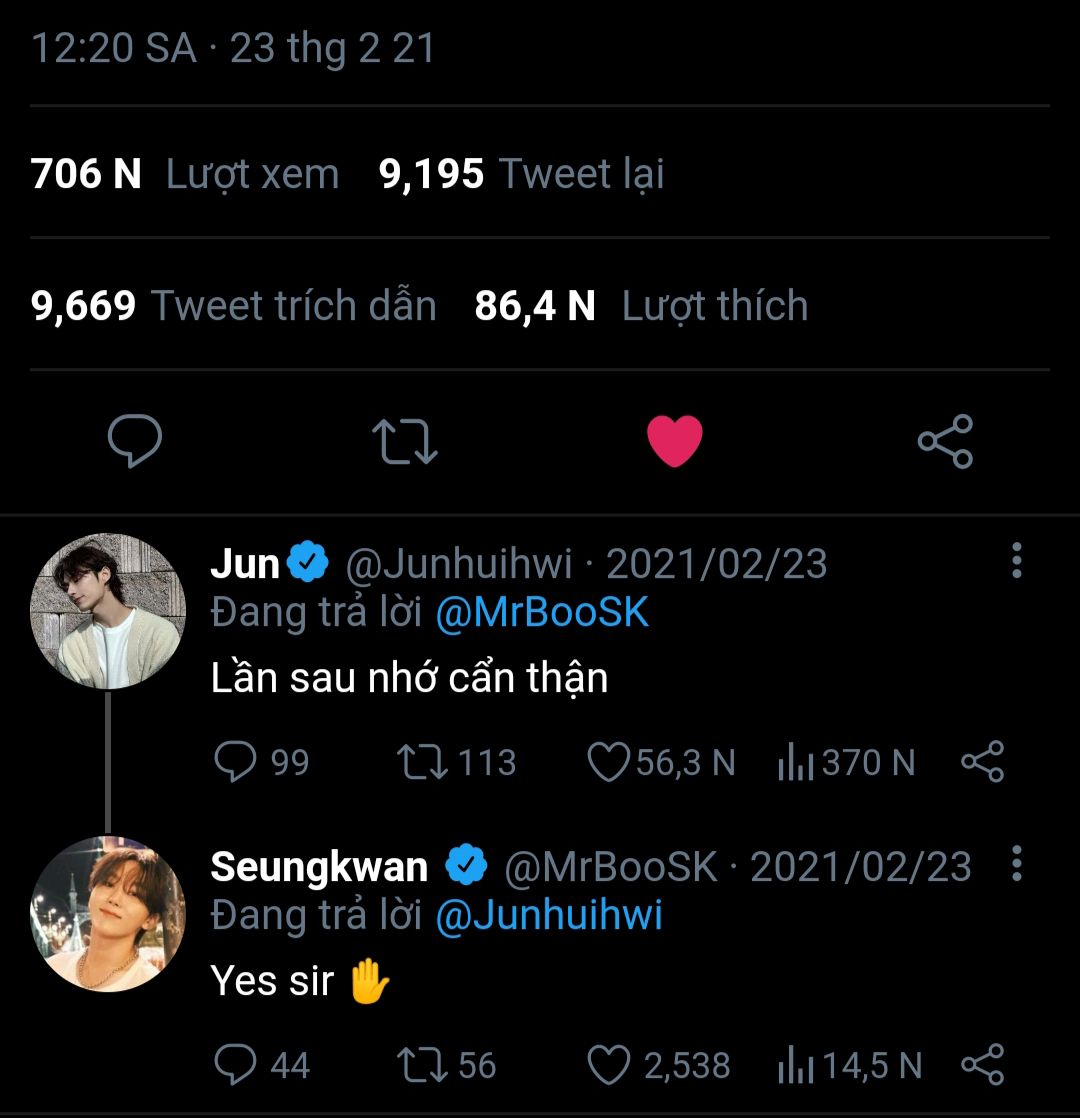 "Có chứ cha nội, không phải, cái anh họ Seo em hay bảo với anh á, là bạn của Junhui rồi hay làm việc ở hai nước nên vắng nhà thường xuyên lắm. Lúc nãy Jun hyung có nói anh Seo ấy nhận điện thoại của mẹ em, rồi điện cho em không được mới gọi ảnh chạy lại coi em sao rồi."