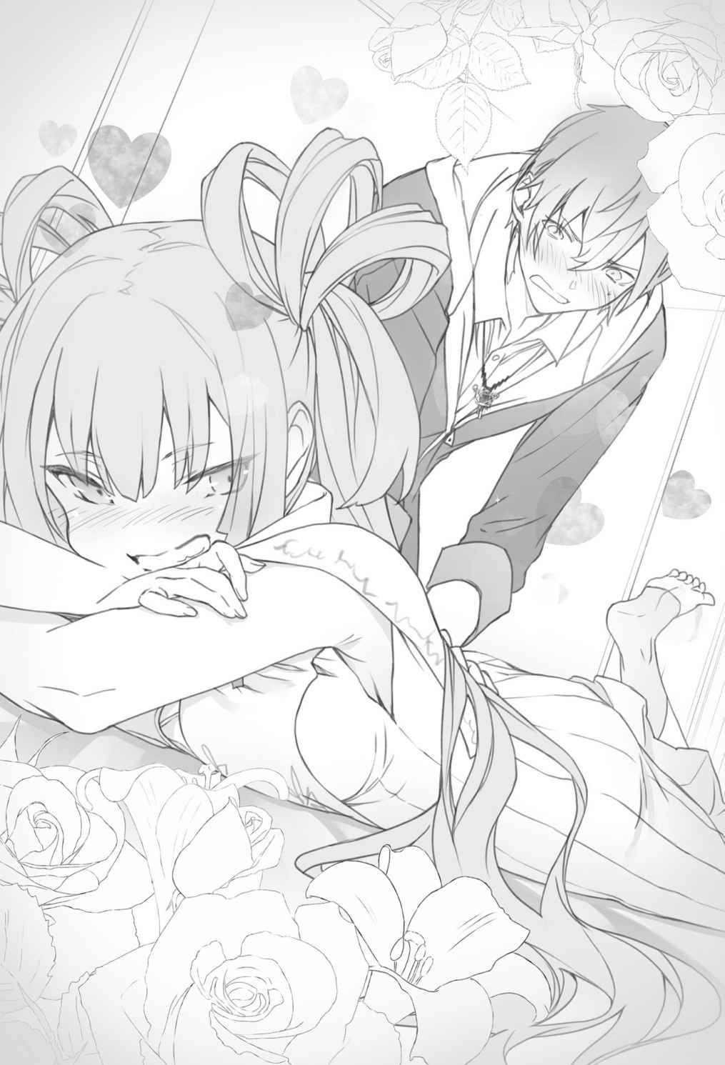 Tuy nhiên, tư thế của chúng tôi hơi...... nguy hiểm, về mọi mặt. Fate-san đang mặc lễ phục giống như Shiro-san và Chronois-san, và có lẽ vì chất liệu mỏng nên tôi có thể nhìn rõ những đường nét trên cơ thể cô ấy khi cô ấy nằm xuống như thế này.