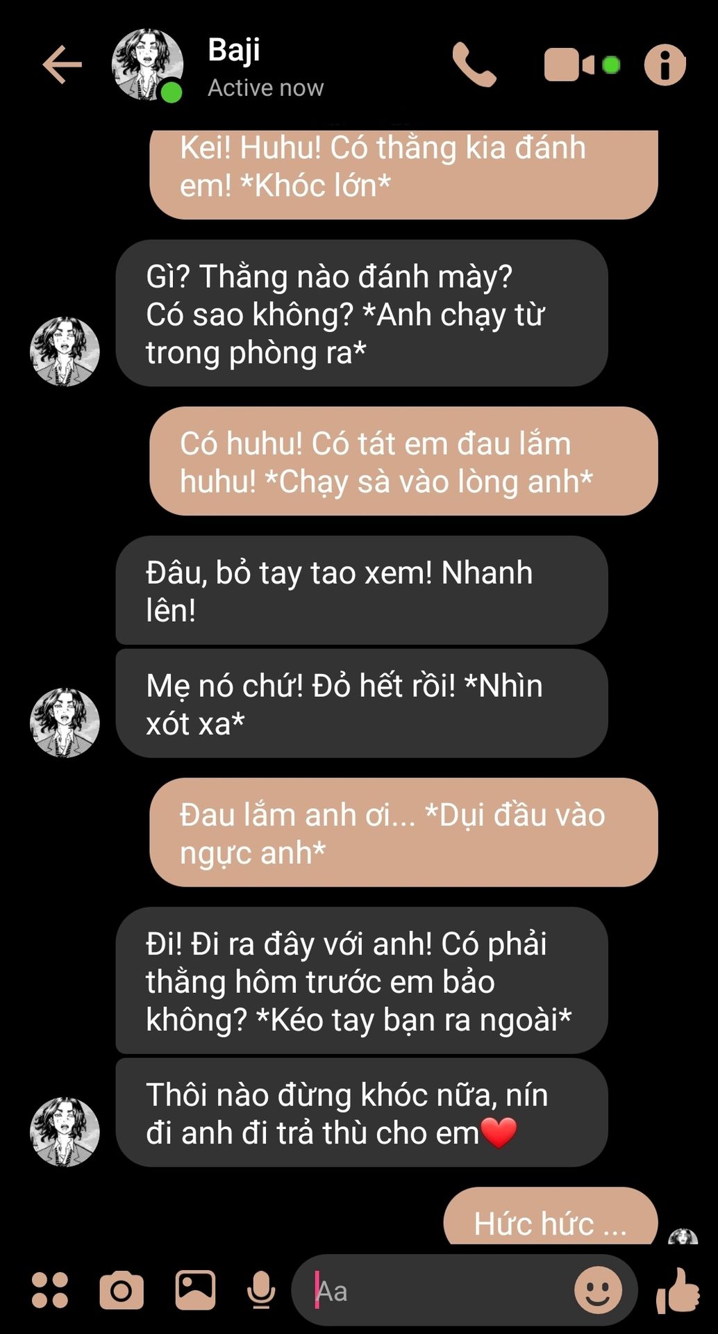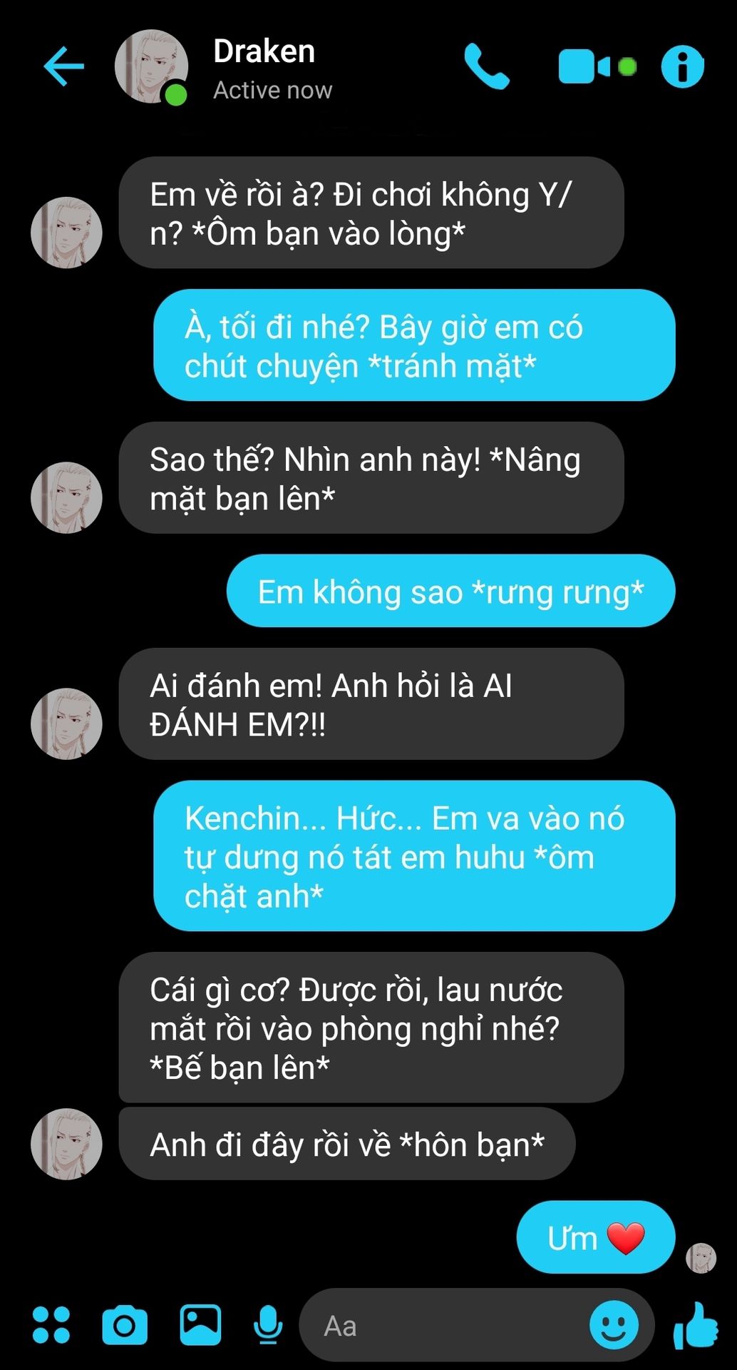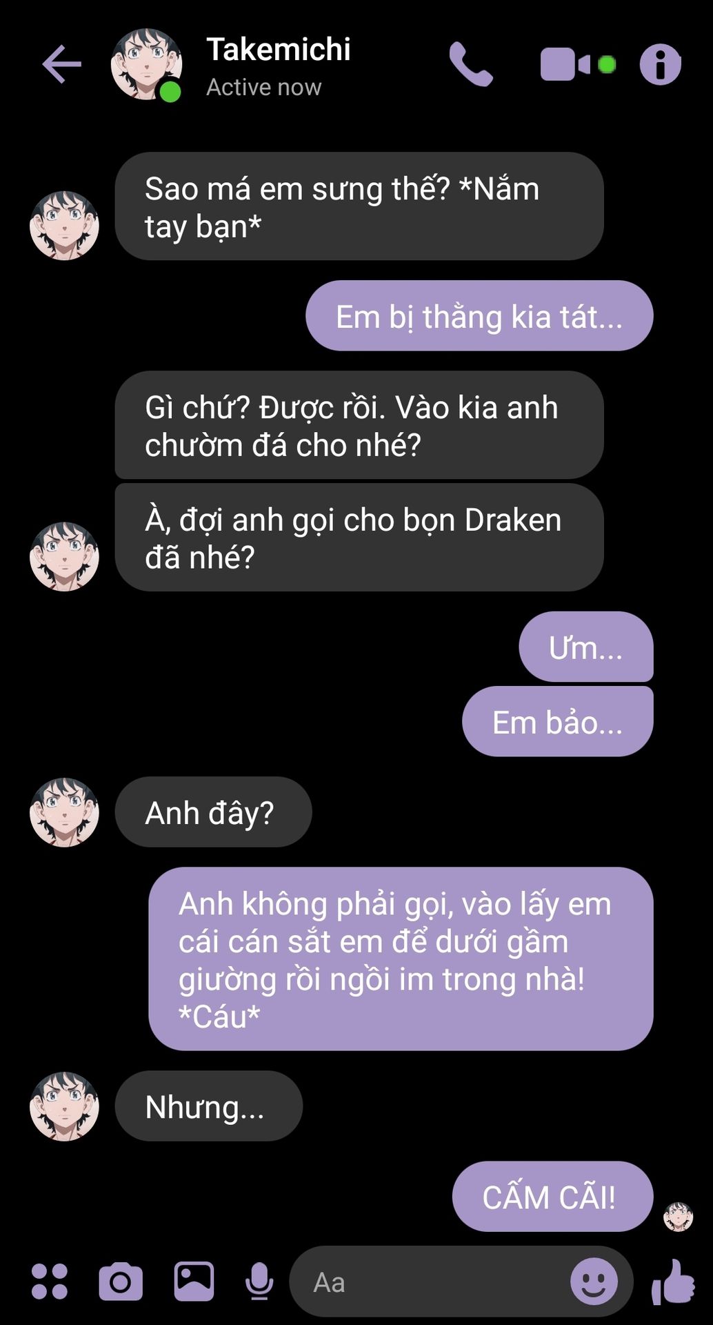 Bên ngoài anh bạo lực nhưng về nhà anh cưng bạn như vàng như bạc. Thế mà bạn vị một thằng ất ơ đánh. Làm sao anh chịu được chứ, cảm giác tệ hơn cả lúc anh thấy Rindou bị Angry đấm cho phát gục luôn... Anh bảo đi mua thuốc là nhưng tiện đường đánh bọn kia luôn.