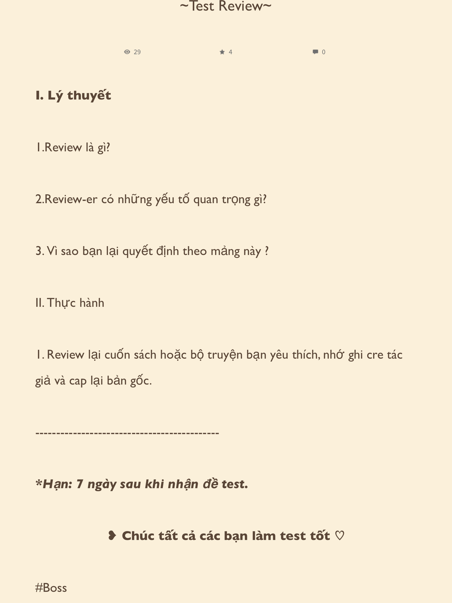 1. Review là đưa ra lời bình phẩm, đánh giá, nhận xét và nói lên suy nghĩ, cảm nhận riêng của bản thân mình về một tác phẩm hoặc có thể là một bộ phim, một sản phẩm mà mình đã từng trải nghiệm qua một cách chân thực và khách quan nhất nhằm giúp đỡ bạn đọc trong việc tìm kiếm một tác phẩm hợp ý mình, cũng như review truyện cho những tác giả để các bạn ấy tiến bộ tốt hơn.