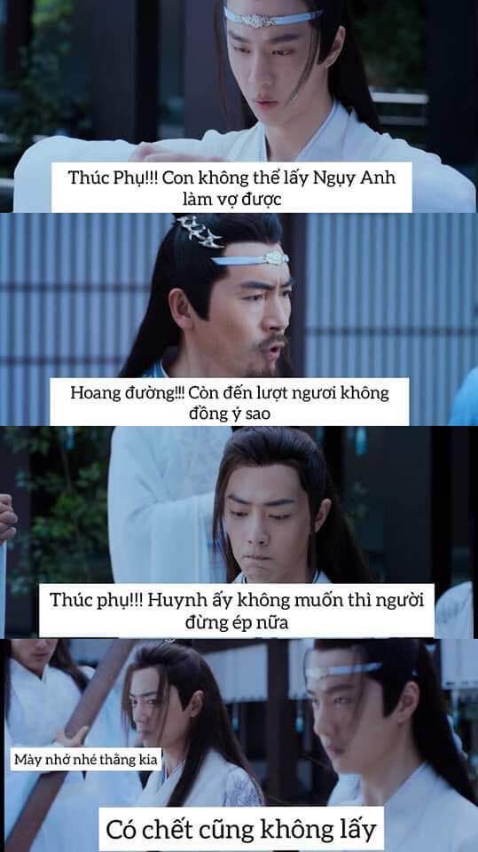 Nguỵ Vô Tiện : Thưa Lam Trạm Nhậu say dụ đệ tử lên giừơng cướp zin con rồi Lam Lão Tiền Bối . Người phải làm chủ cho đệ tử ... Học trò không còn mặt mũi nào về Giang Gia nữa ... Lam Hy Thần : Đệ thật là làm mất mặt Lam gia ..Gia Quy gia huấn tiết tháo đều bị Đệ quên sạch rồi.... Lam Vong Cơ : Đệ !! ..... đệ trong lúc say lỡ...