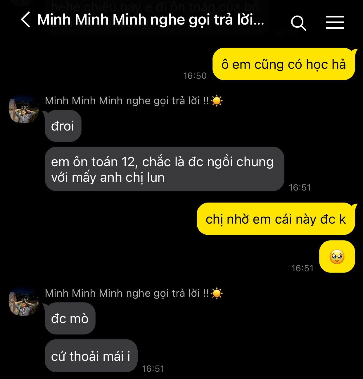 " em là Minh, bạn của thằng Khôi.. em biết chị mà, biết chị đợt văn nghệ ấy, không biết chị có xem tiết mục lớp em không? "