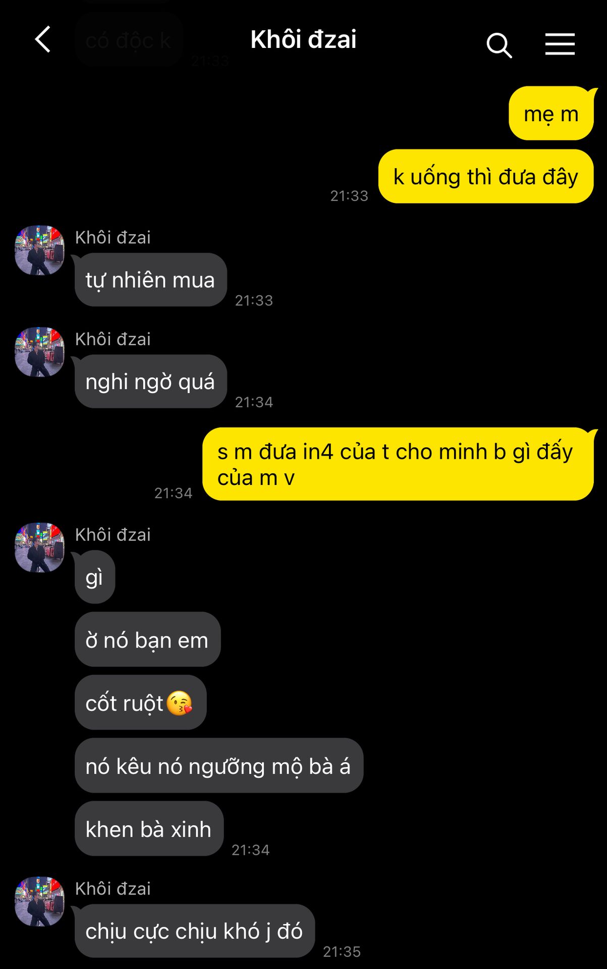 " gì.. thằng Khôi mà bắt nạt chị á, chính nó là người giới thiệu khoe khoang nó có chị gái xinh đẹp giỏi giang cho khắp lớp của em đấy cơ "
