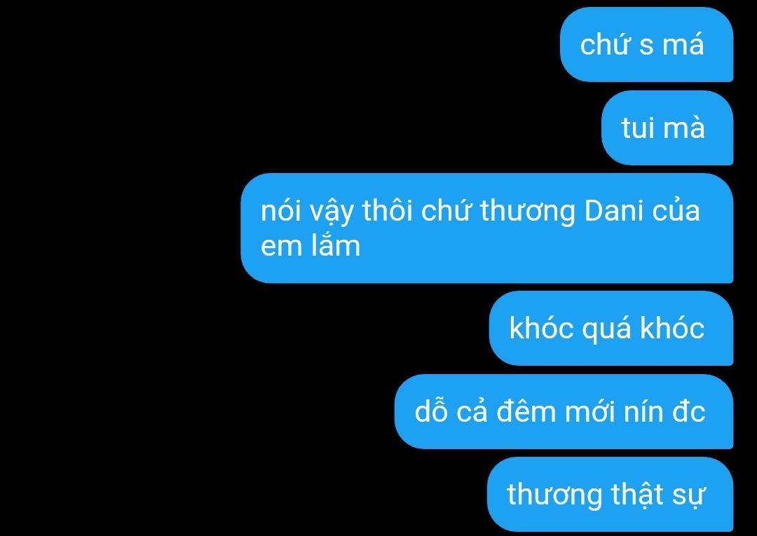"Babe ơi , đã ngủ chưa ? Cho em đi chơi tí nha , tại có hẹn cafe với mấy nhỏ á " lon ton đứng trước mặt Dani nhảy cẩng lên hào hứng , mặt mũi tươi như hoa mới hái không biết điều gì đã làm cô vui sướng đến vậy ?