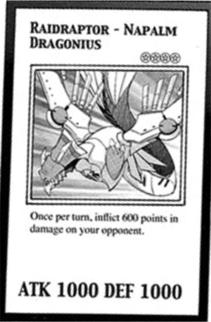 【 Raidraptor - Napalm Dragonius ( bản manga ) | Winged Beast, thuộc tính Ám, Level 4, DEF: 1000, hiệu ứng: ①: 1 lượt 1 lần, gây cho đối phương 600 thiệt hại. 】